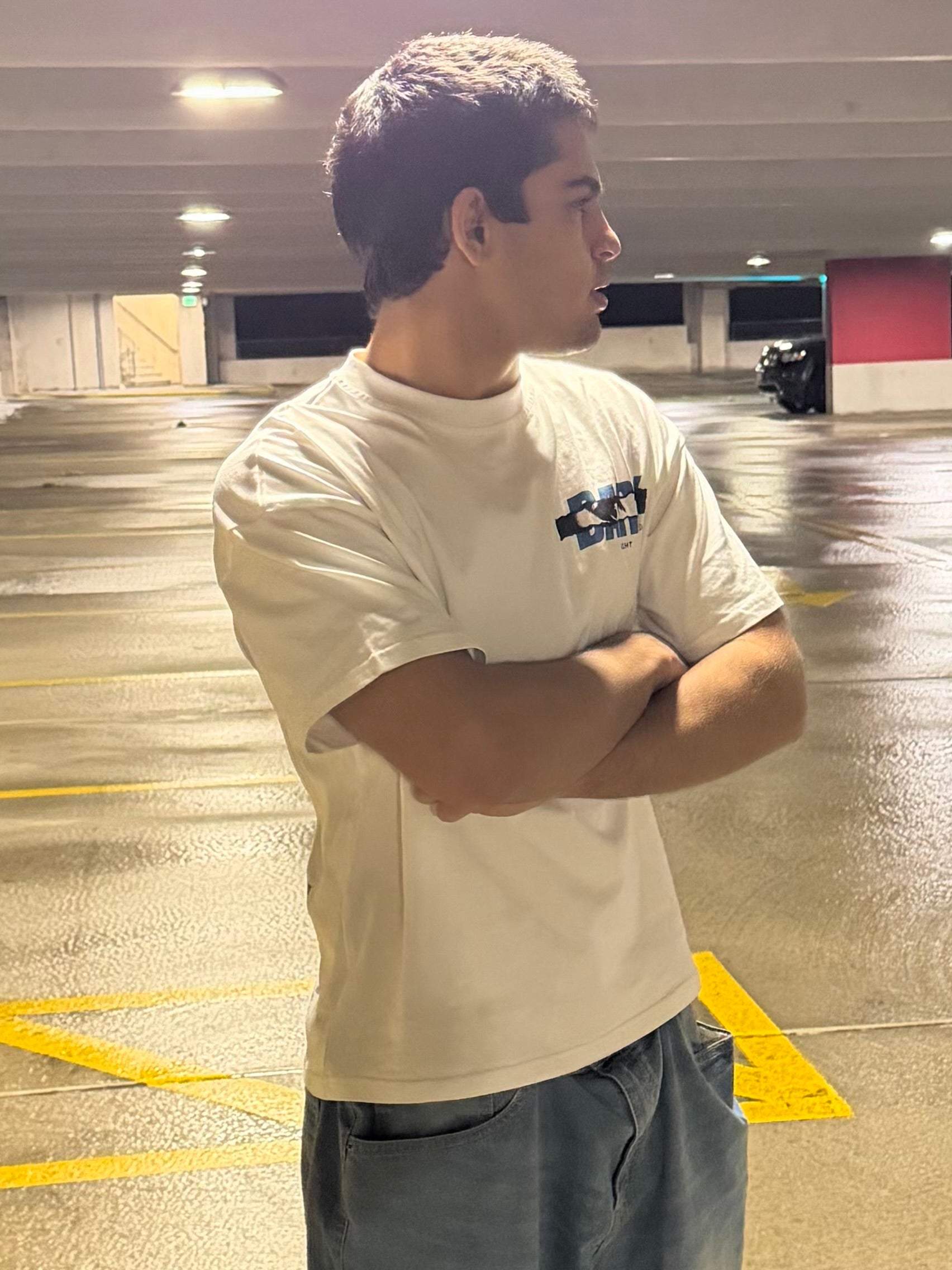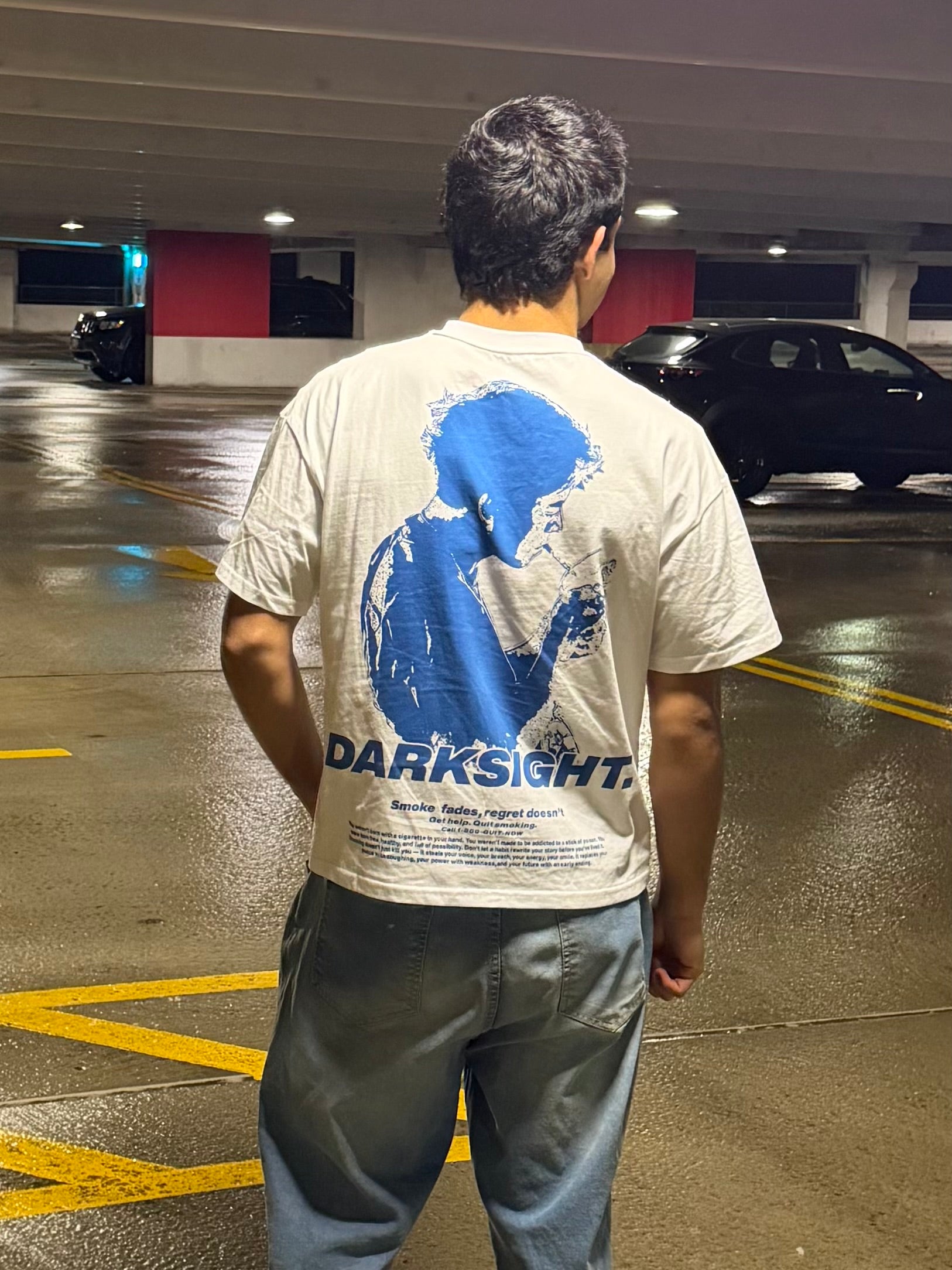Model is 5’10 165 wearing a small. White heavyweight t-shirt constructed from 100% cotton at 220 GSM. Oversized, boxy fit with a structured drape. Features a small distorted Darksight logo on the front and a bold blue smoking silhouette graphic on the back, anchored by the statement “SMOKE FADES. REGRET DOESN’T.” Designed to contrast purity with consequence. 10% of all sales from this drop will be donated to a donation center selected specifically for this release.
